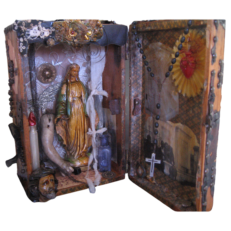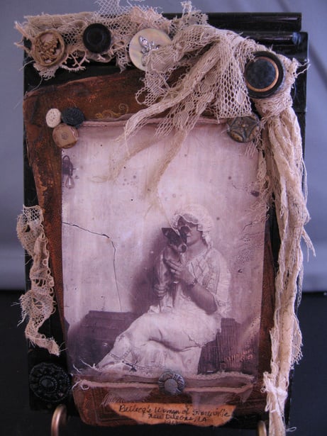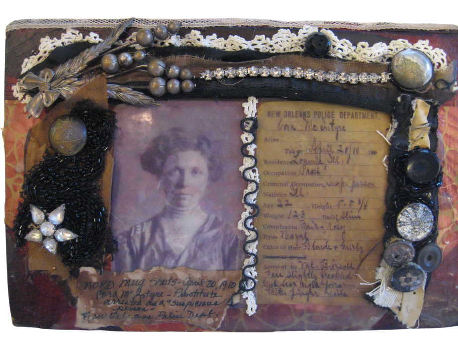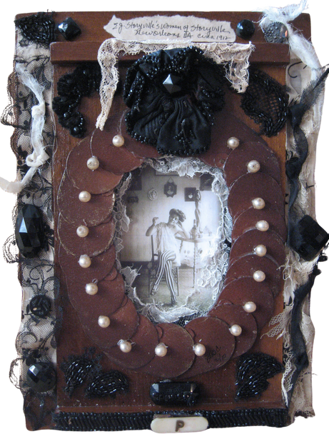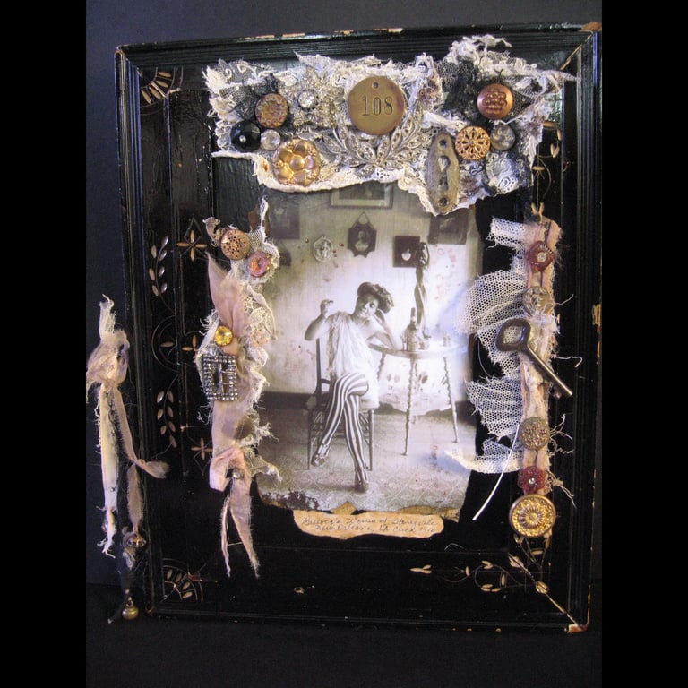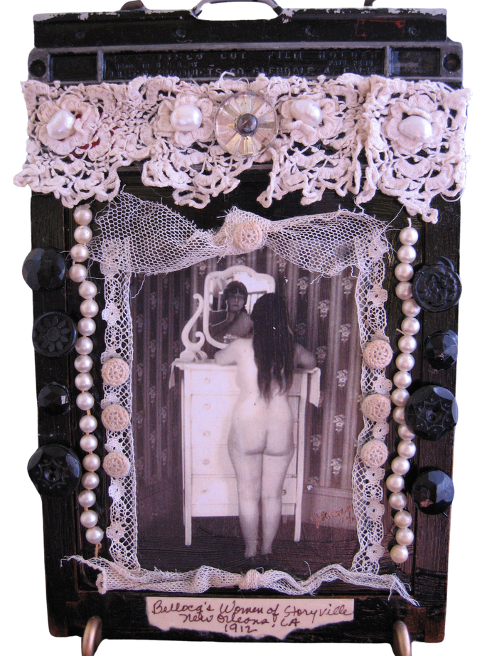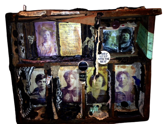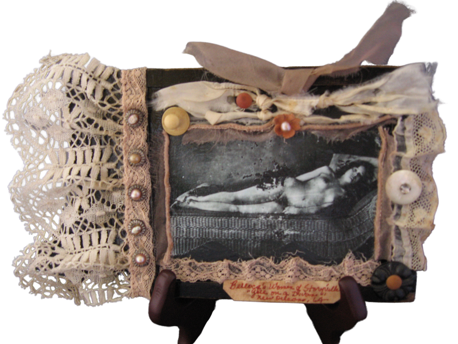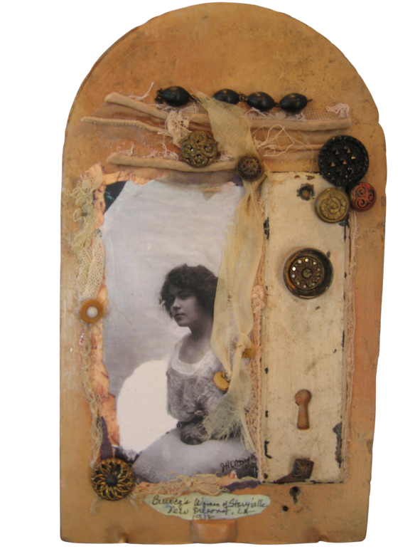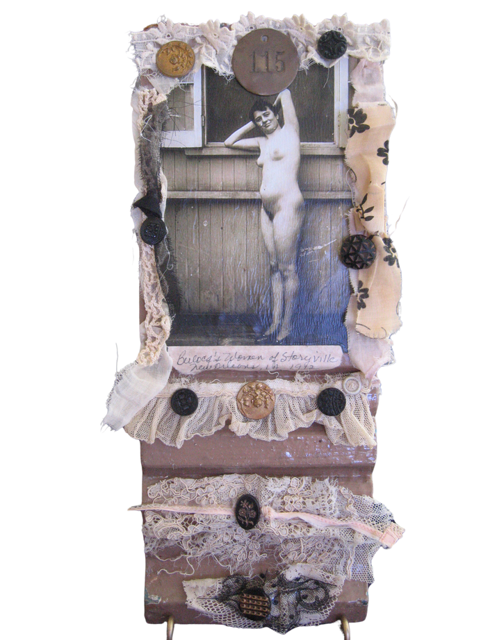 Because of my interest in historic New Orleans - I focus on the old and crumbling cemetery tombs, the women of Storyville and others arrested during the Storyville era (1898-1917). In my work, I use salvaged items, vintage jewelry, rusted hardware, skulls and bones, broken dolls vintage photographs, and my own. I search antique stores, flea markets and estate sales for old New Orleans ephemera. I create assemblages and shrines of my finds.