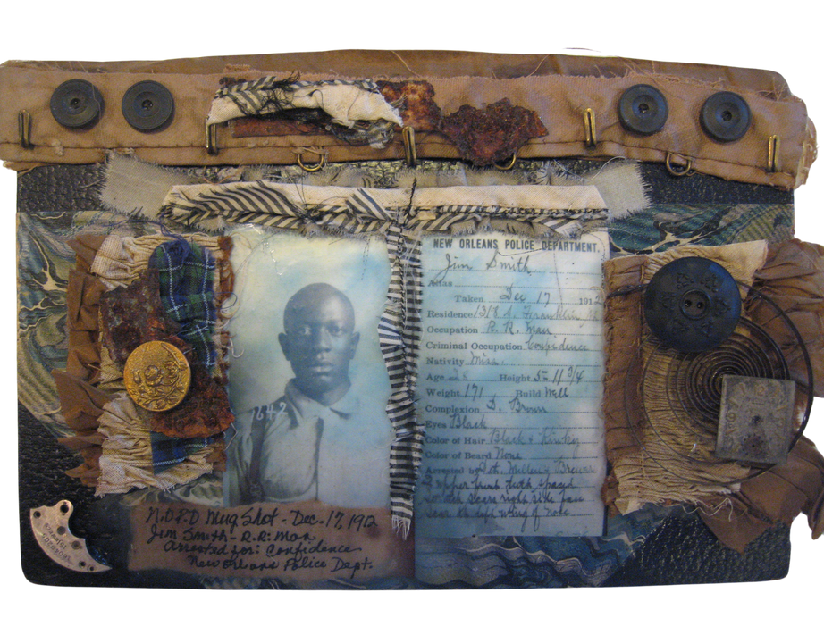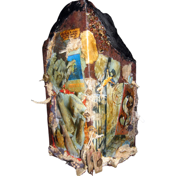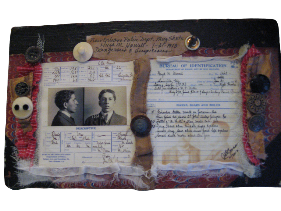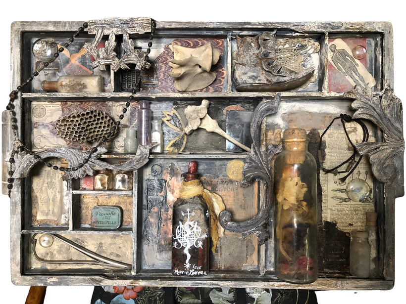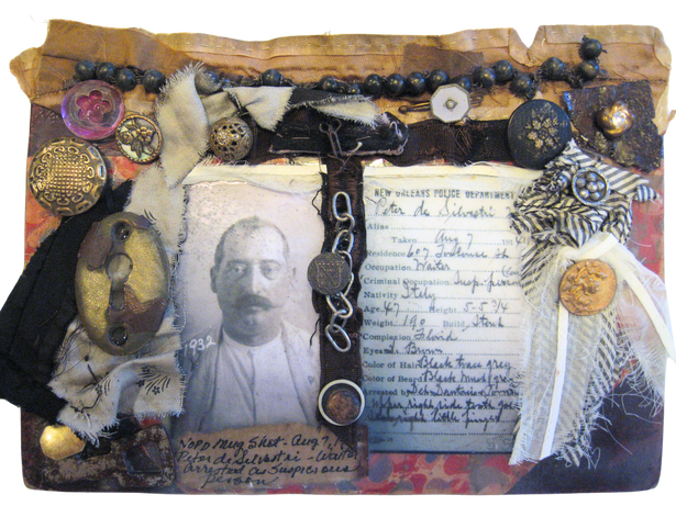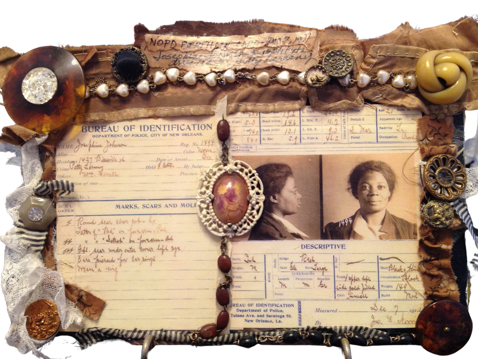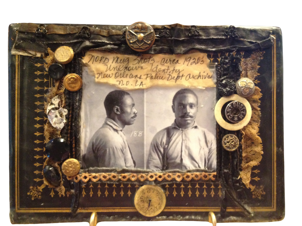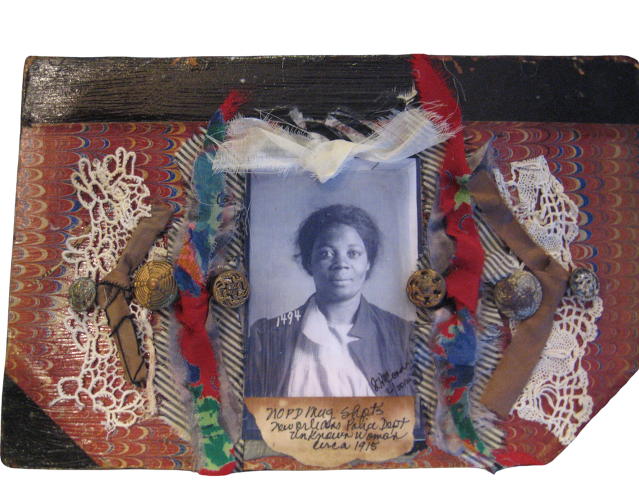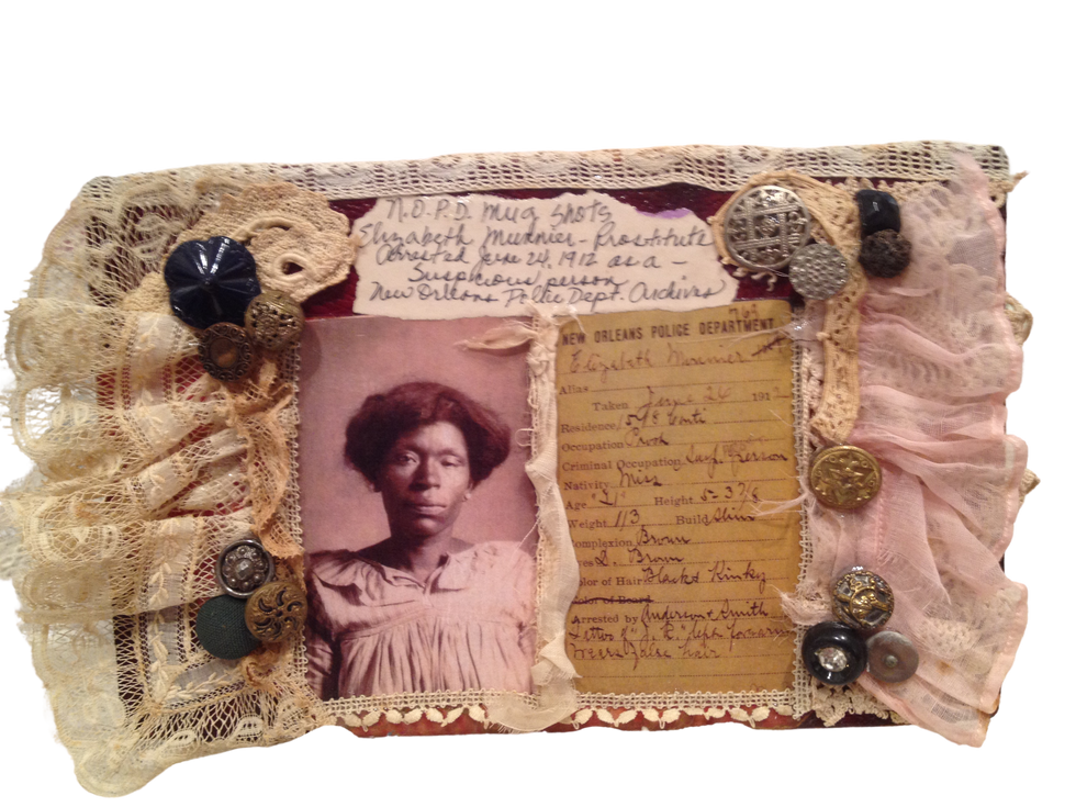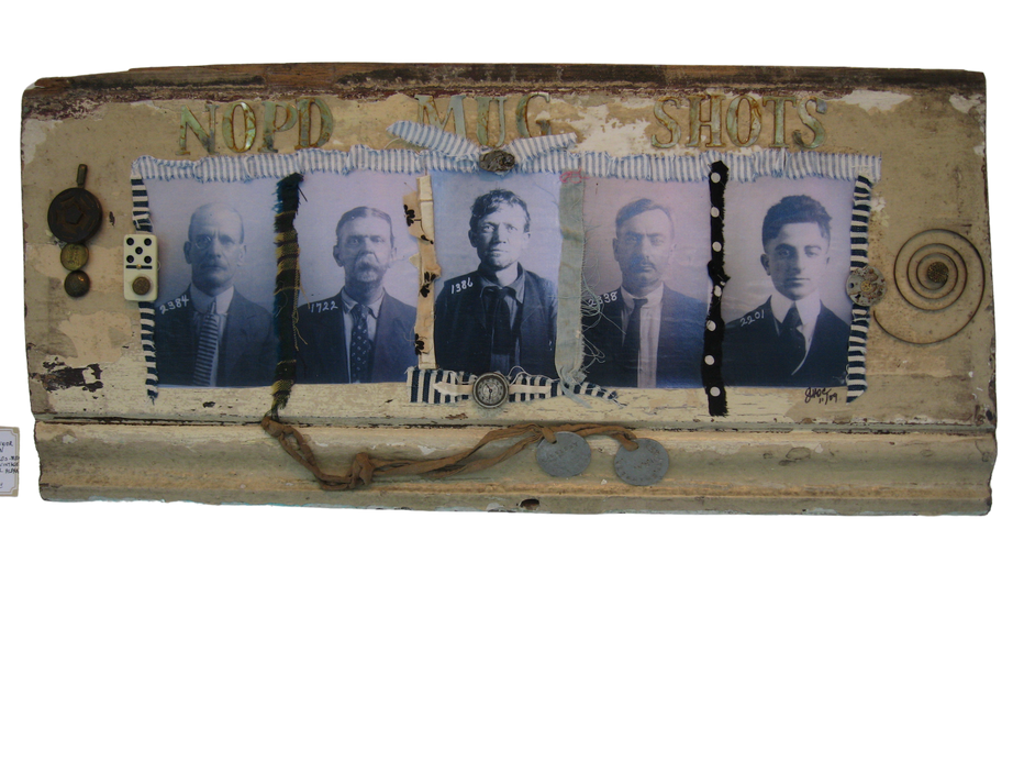 Because of my interest in historic New Orleans - I focus on the old and crumbling cemetery tombs, the women of Storyville and others arrested during the Storyville era (1898-1917). In my work, I use salvaged items, vintage jewelry, rusted hardware, skulls and bones, broken dolls vintage photographs, and my own. I search antique stores, flea markets and estate sales for old New Orleans ephemera. I create assemblages and shrines of my finds.