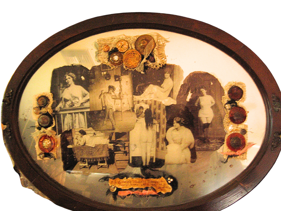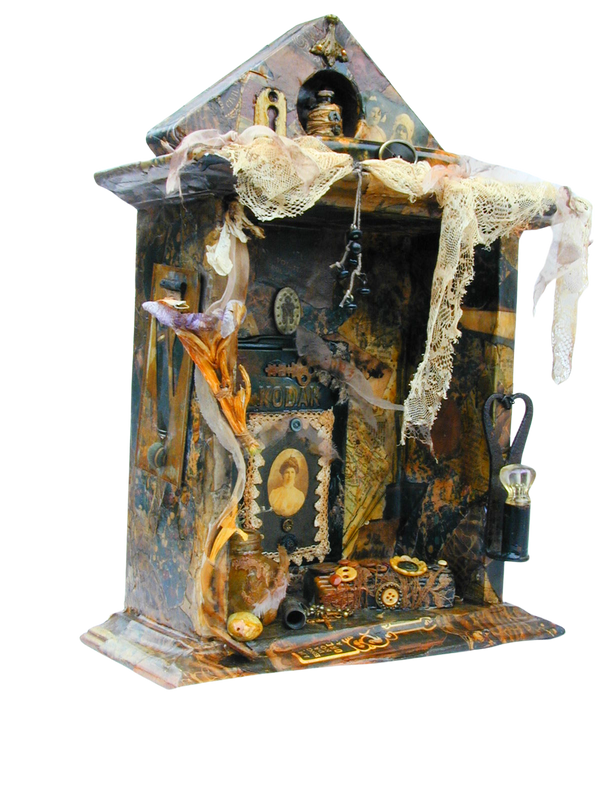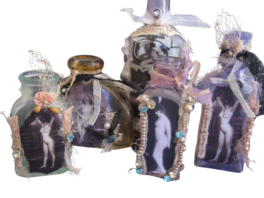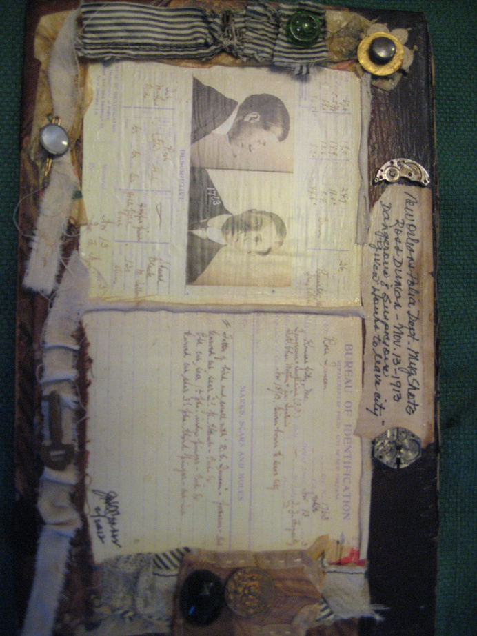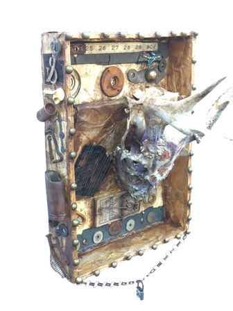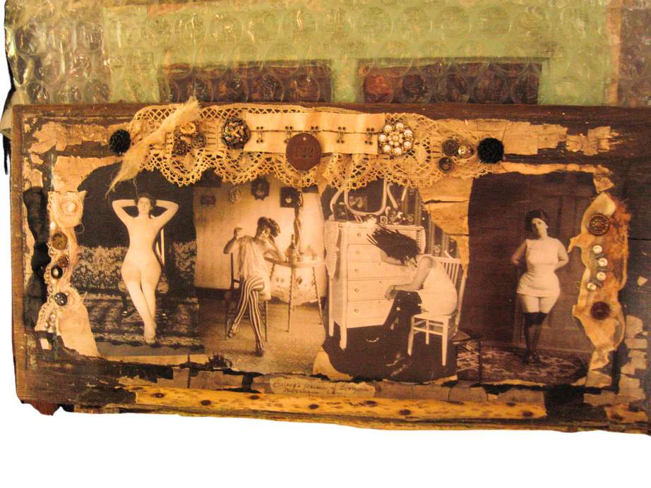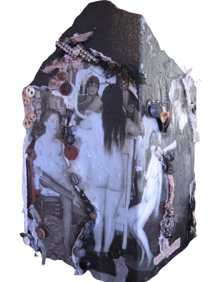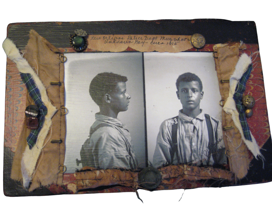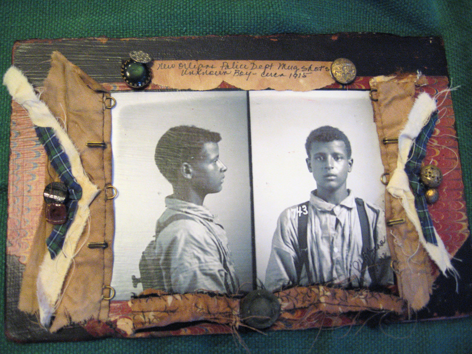 Because of my interest in historic New Orleans - I focus on the old and crumbling cemetery tombs, the women of Storyville and others arrested during the Storyville era (1898-1917). In my work, I use salvaged items, vintage jewelry, rusted hardware, skulls and bones, broken dolls vintage photographs, and my own. I search antique stores, flea markets and estate sales for old New Orleans ephemera. I create assemblages and shrines of my finds.