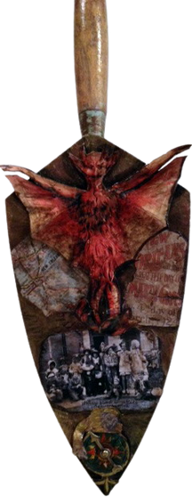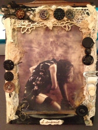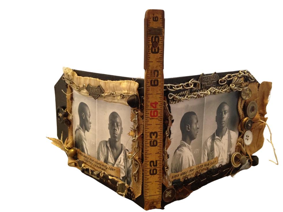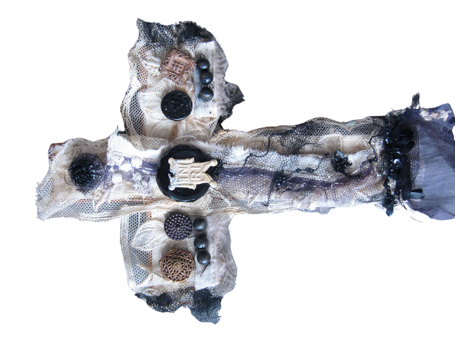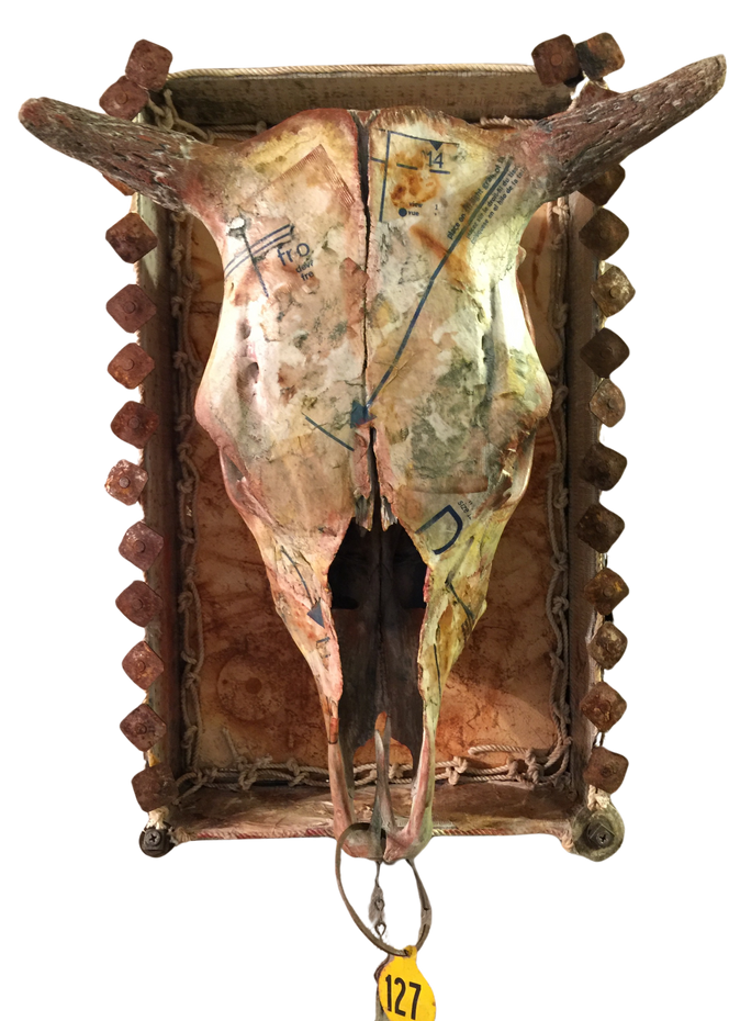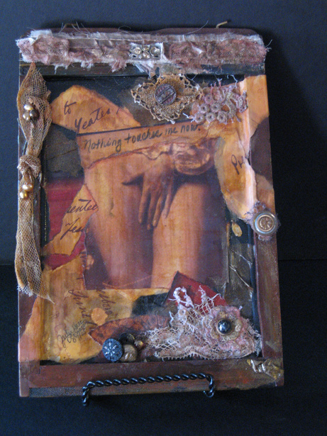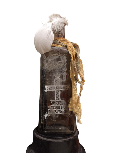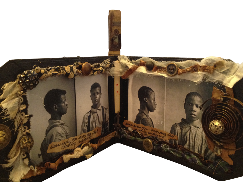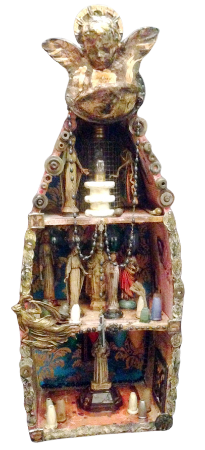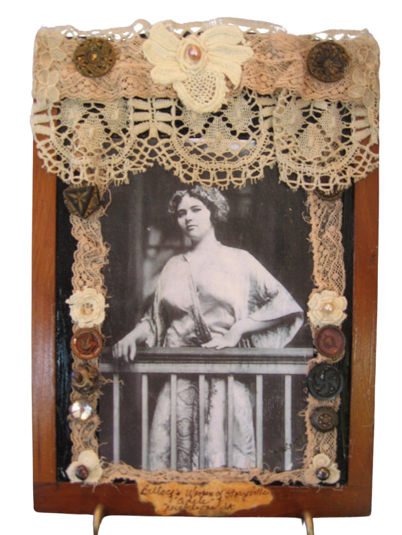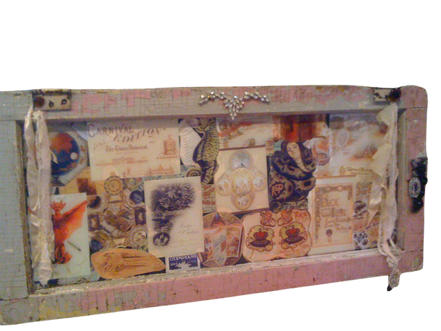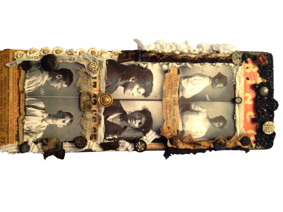 Because of my interest in historic New Orleans - I focus on the old and crumbling cemetery tombs, the women of Storyville and others arrested during the Storyville era (1898-1917). In my work, I use salvaged items, vintage jewelry, rusted hardware, skulls and bones, broken dolls vintage photographs, and my own. I search antique stores, flea markets and estate sales for old New Orleans ephemera. I create assemblages and shrines of my finds.
