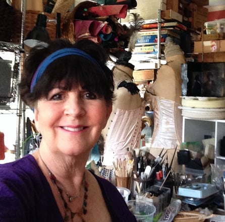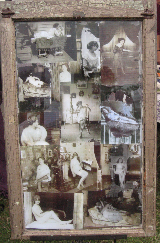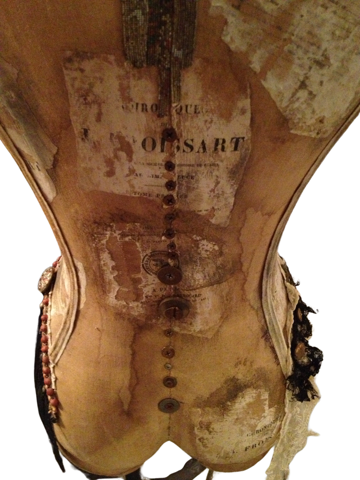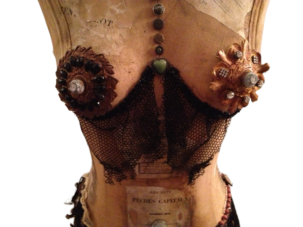 During a “dumpster dive” at a local mall, my friend and I discovered several linen-covered male and female mannequins - many with stands. We hauled these out along with other fixtures, lights, and supplies. Shown here is my “Storyville steampunk” woman who went to live in the dressing room of a Nashville, TN customer.